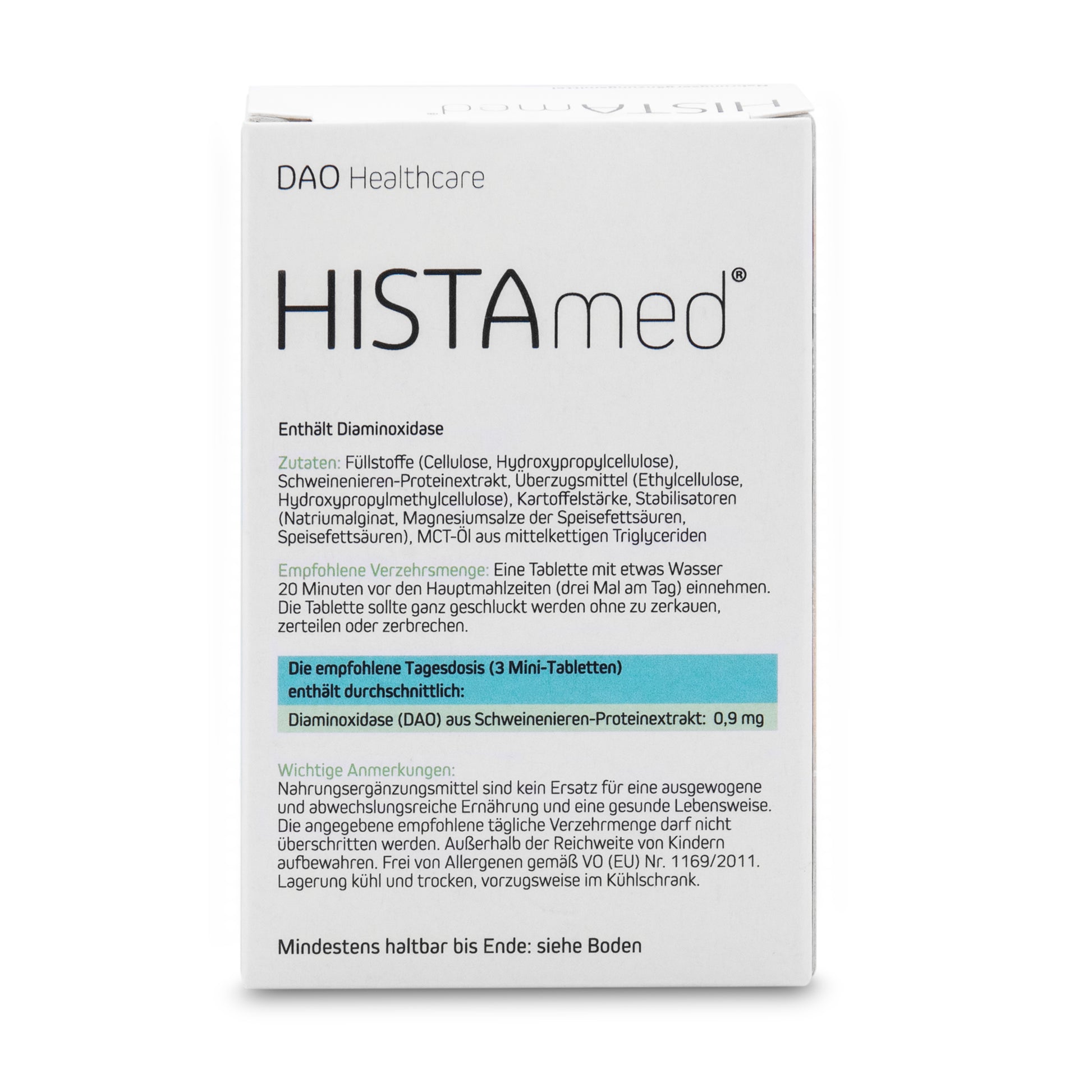 HISTAmed® DAOpur ist ein speziell entwickeltes Nahrungsergänzungsmittel, welches das Enzym Diaminoxidase (DAO) enthält. Das Enzym aus HISTAmed DAOpur ergänzt das körpereigene Enzym zum Histaminabbau aus der Nahrung. Durch eine magensaftresistente Oberfläche gelangt das Enzym in den Darm, ohne im Magen verbraucht bzw. durch den niedrigen pH-Wert des Magensaftes zerstört zu werden. Das Produkt ist frei von Gluten und Lactose und daher auch geeignet für Personen mit entsprechenden Unverträglichkeiten.