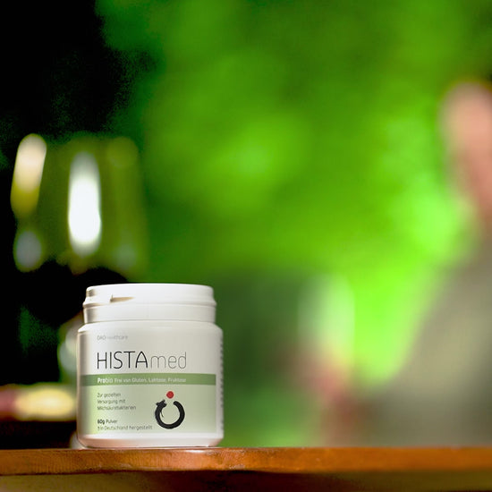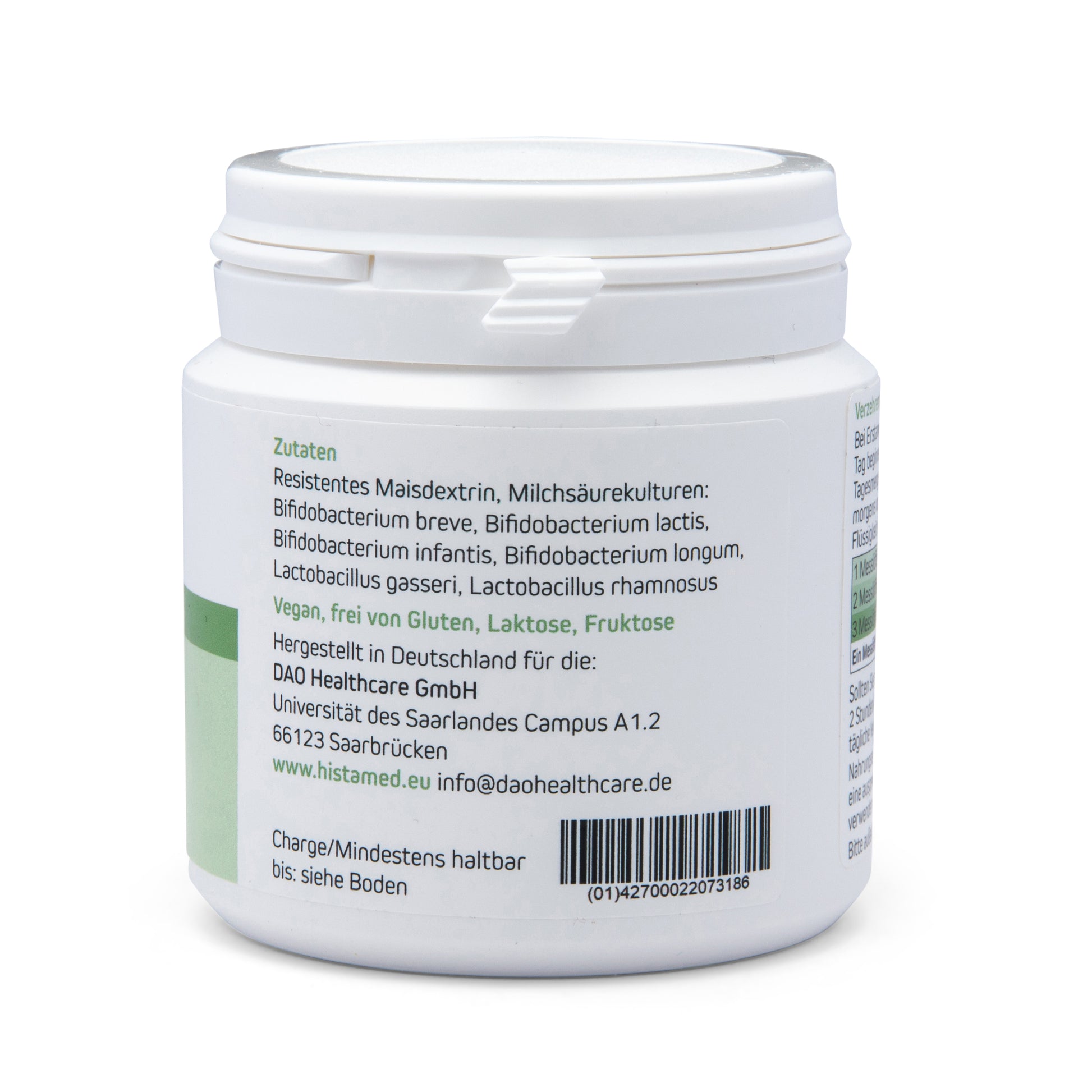HISTAmed® Probio Pulver enthält die Milchsäurebakterienkulturen Bifidobakterium infantis und Bifidobakterium longum, welche nachweislich kein Histamin produzieren. Zusätzlich werden Reaktionen des Enzyms Histamincarboxylase (baut die Aminosäure Histidin zu Histamin ab) sowie des H1-Rezeptors (vermittelt die bekannten allergischen Reaktionen des Histamins) unterdrückt.